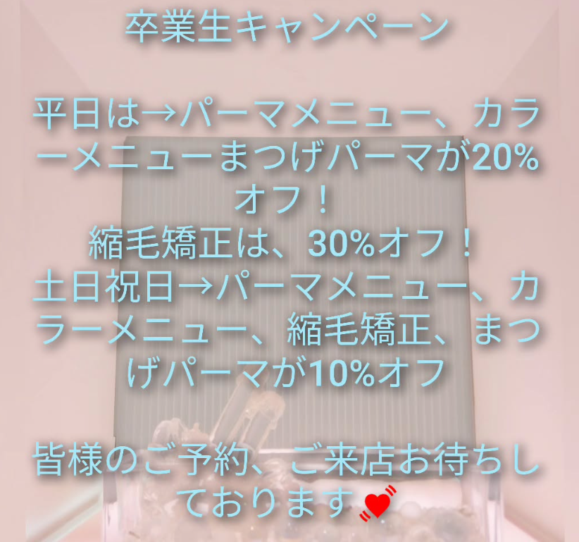 予約の際に「卒業生キャンペーンで」と伝えてください🙋🎵